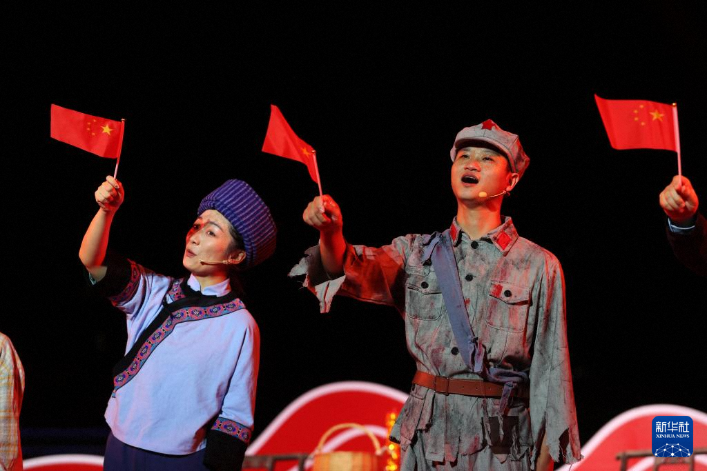 10月1日,演員在重慶市黔江區(qū)武陵水岸表演紅色情景劇《守望》。新華社發(fā)(楊敏攝)