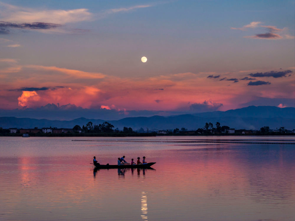 10月6日,人們乘船在云南大理洱源西湖賞月(無(wú)人機(jī)照片)。新華社發(fā)(羅新才攝)