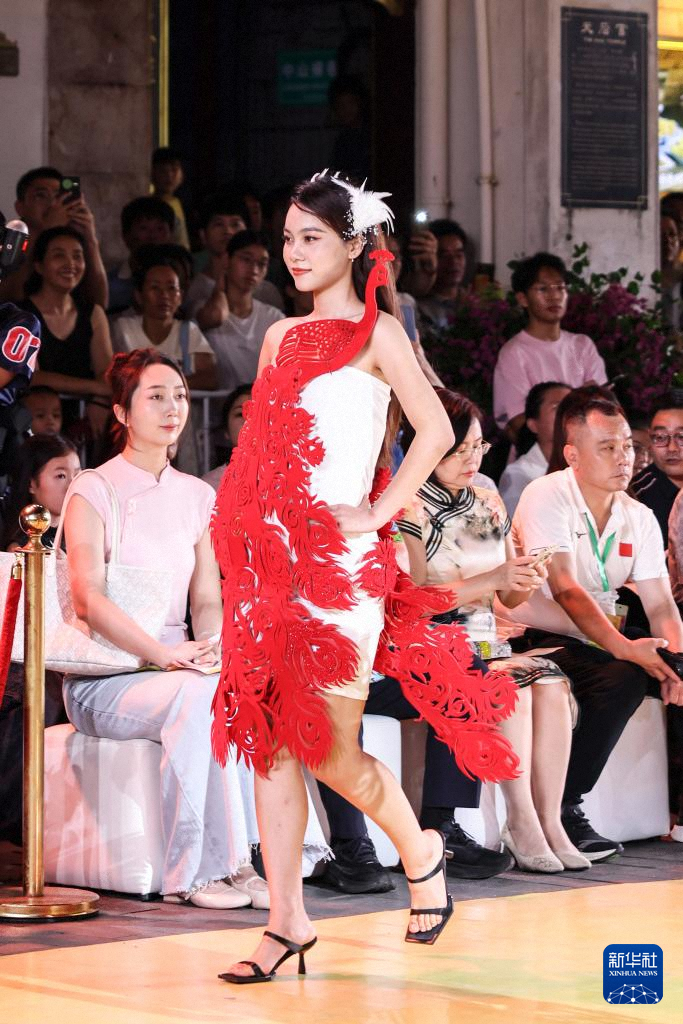 10月7日晚,作為2025??谒囆g(shù)周系列活動(dòng)之一,錦色·2025非遺潮秀在海口騎樓老街啟幕。活動(dòng)以“非遺再創(chuàng)”為核心,將剪紙藝術(shù)元素融入時(shí)裝走秀。新華社記者 張麗蕓 攝