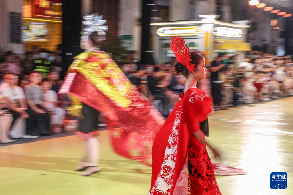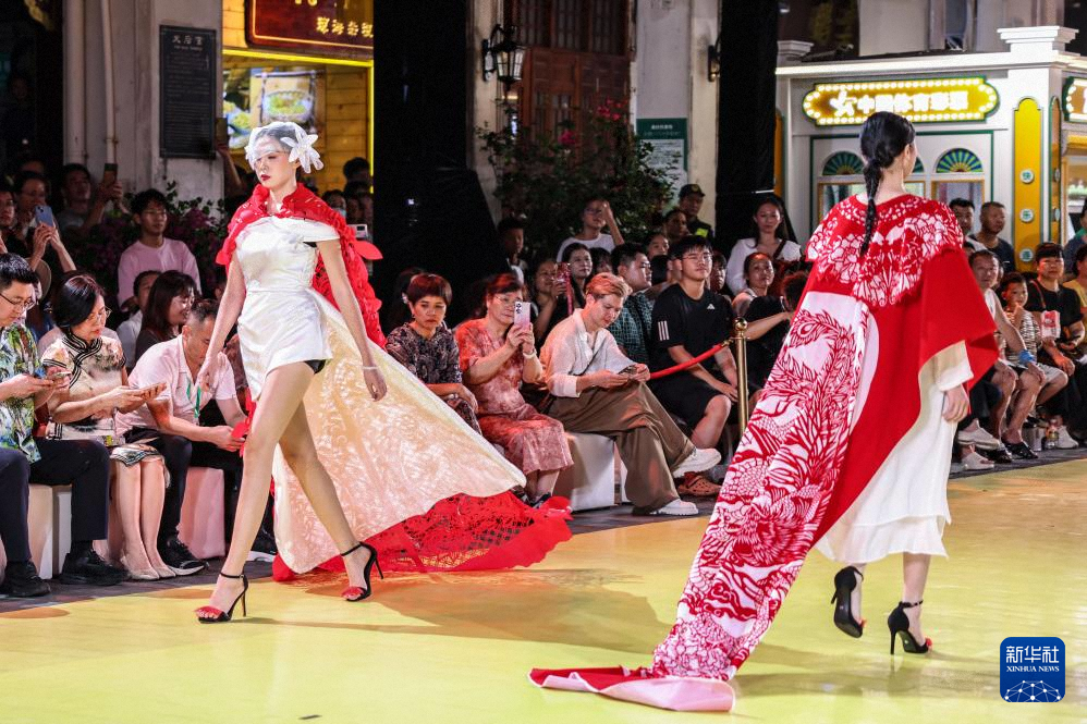 10月7日,身穿剪紙主題時(shí)裝的模特在??隍T樓老街走秀。新華社記者 張麗蕓 攝
