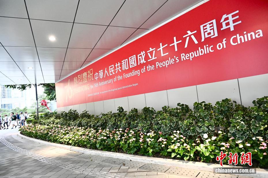 國慶節(jié)臨近,9月25日,香港街頭迎國慶氣氛濃厚。圖為香港特區(qū)政府總部外墻張貼的慶祝標語。