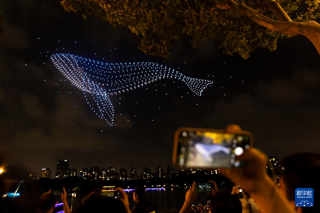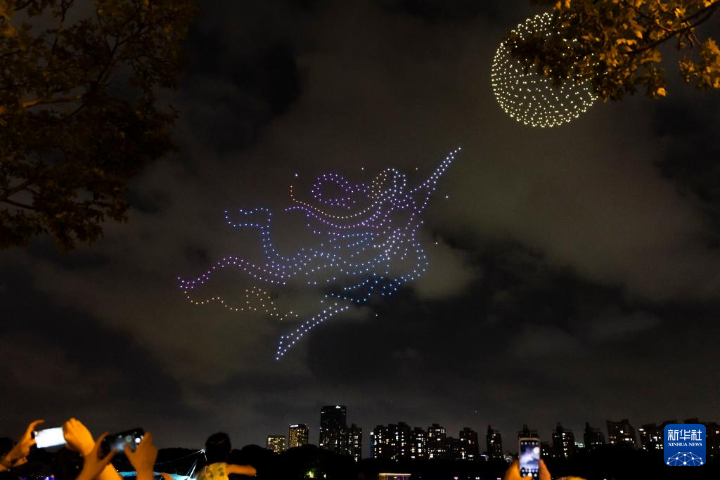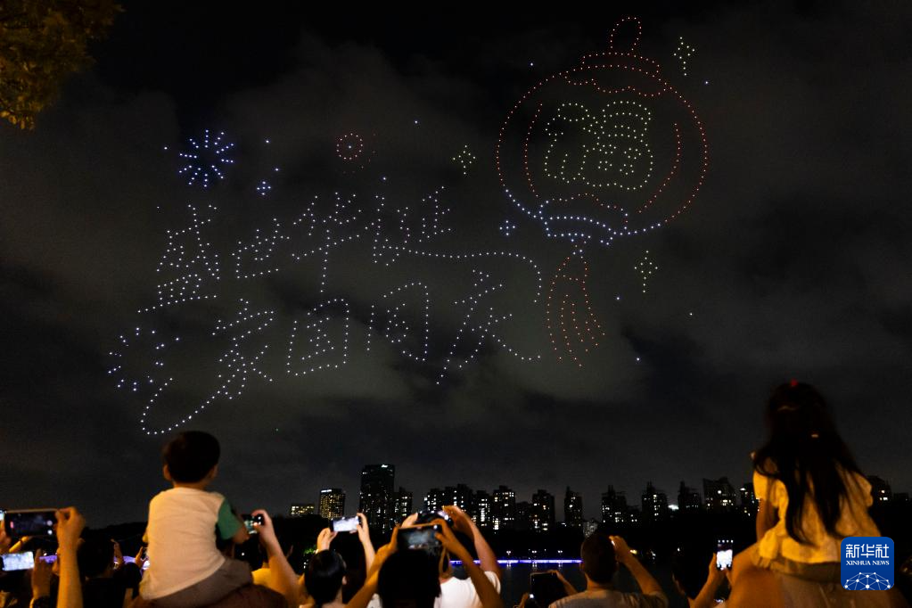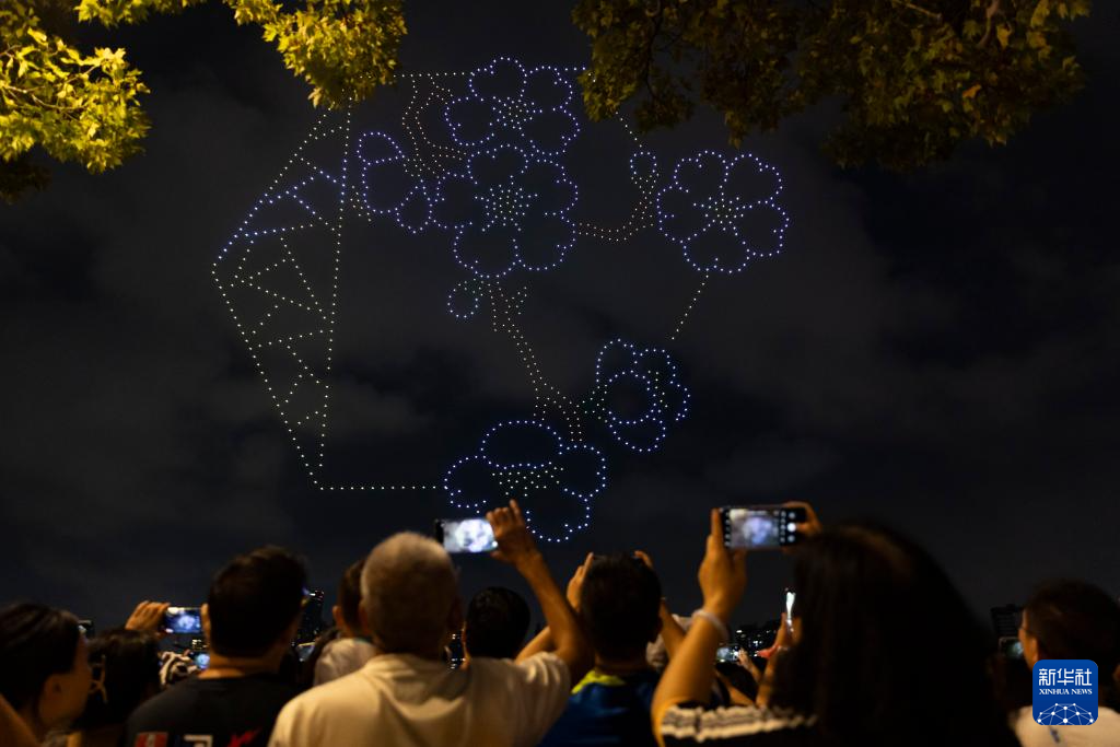 當晚,“世紀璀璨——無人機燈光秀”表演在上海世紀公園舉行,1000架無人機在世紀公園鏡天湖上空組成“國慶快樂”“盛世華誕 家國同慶”“浦東歡迎您”等字樣和玉蘭、荷花、梅花等花卉圖案,在國慶假期即將到來之際,為市民游客獻上一場視覺盛宴。
