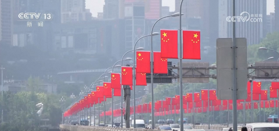 在重慶渝中區(qū),當(dāng)?shù)卦陂L江大橋等20條重要路段以及城市交通要道、旅游景點周邊的道路燈桿上懸掛了4000余面五星紅旗,將城市妝點得格外喜慶。