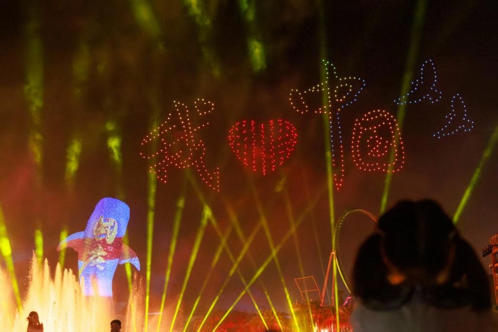 廣東珠海長(zhǎng)隆海洋王國(guó)推出特色光影秀,為游客獻(xiàn)上了視覺(jué)盛宴——超600臺(tái)無(wú)人機(jī)的編隊(duì)變幻出企鵝、鯨鯊等珍稀海洋動(dòng)物,結(jié)合絢爛的燈光投影以及紅色主題的節(jié)目編創(chuàng),再加上珠海科技“特產(chǎn)”無(wú)人船,360度環(huán)繞煙花效果……