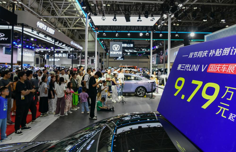 10月1日,市民在2025第46屆中國(福州)國際汽車博覽會現(xiàn)場觀看車商的促銷活動。新華社記者 魏培全 攝