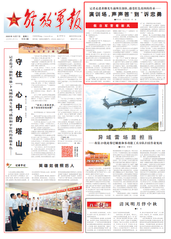 假日探營,記者發(fā)現(xiàn),英雄精神已成為浸潤部隊(duì)的紅色家風(fēng),繼而轉(zhuǎn)化為官兵矢志報國的精神動力。演訓(xùn)場上,鏗鏘的答“到”聲,在記者耳邊回響,展示了新時代革命軍人的忠誠與勇敢。