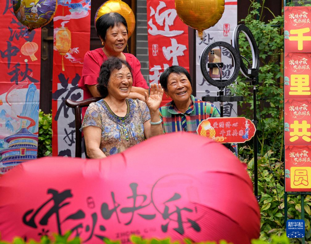 10月6日,在江蘇省海安市墩頭鎮(zhèn)寶祥村“情滿中秋 愛暖僑心”活動(dòng)中,僑眷們與海外親人視頻連線。新華社發(fā)(周強(qiáng)攝)