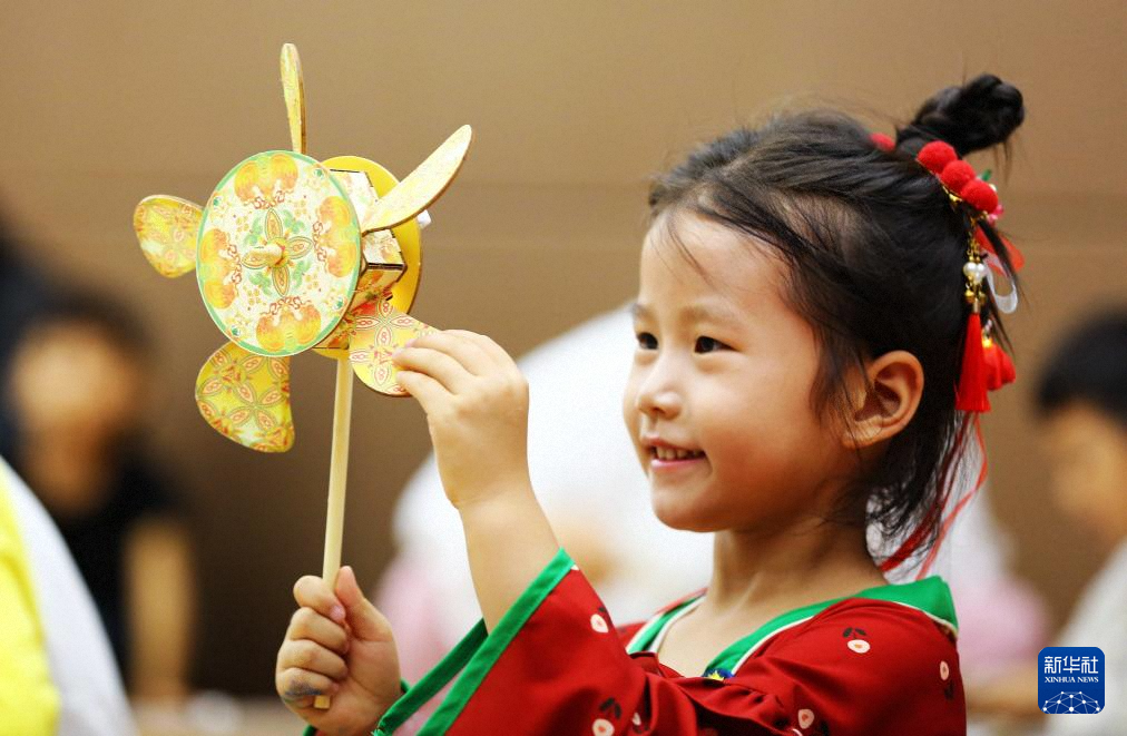 10月6日,在山東省滕州市博物館,小朋友制作“風(fēng)車轉(zhuǎn)花燈”。新華社發(fā)(李志軍攝)