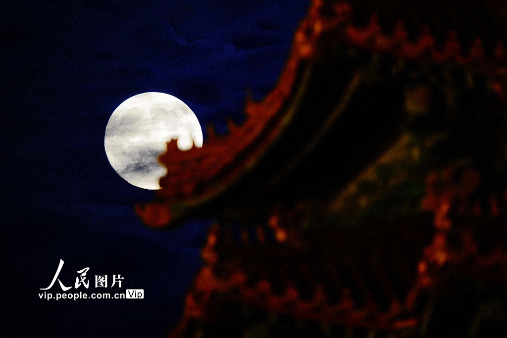 10月6日,一輪圓月現身夜空,與故宮角樓上的脊獸悄然同框。宋家儒攝(人民圖片網)