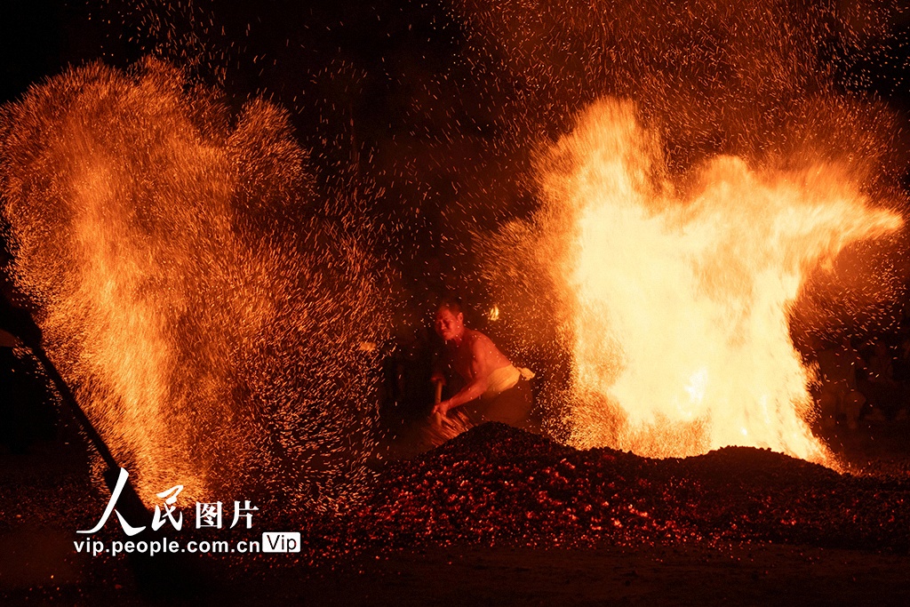 10月6日晚,浙江省金華市磐安縣雙峰鄉(xiāng),村民在表演“煉火”民俗活動,歡慶中秋佳節(jié)。張輝攝(人民圖片網)