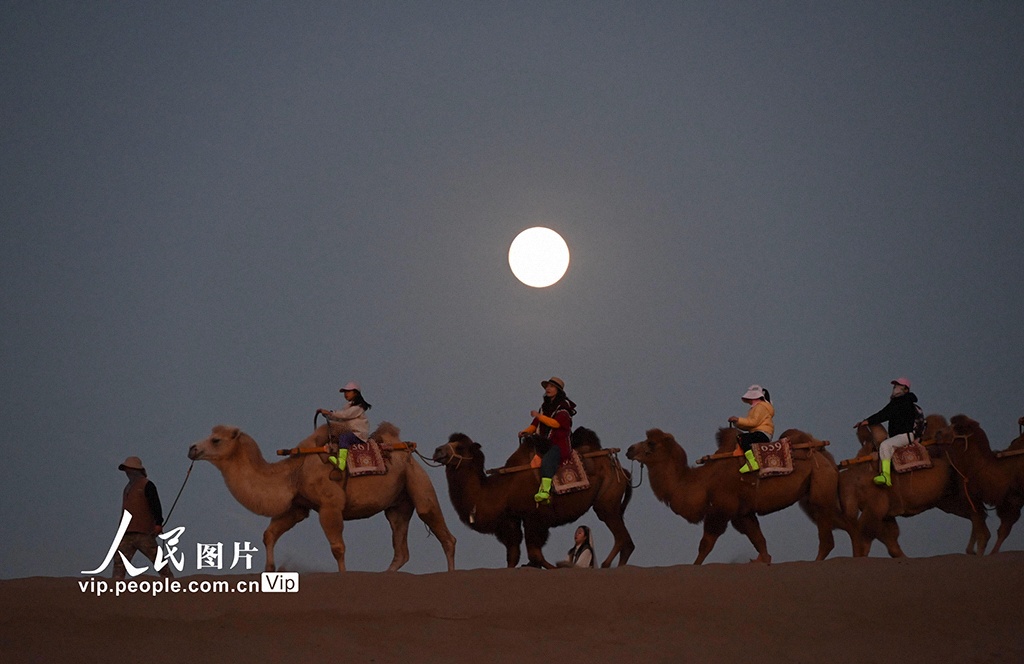 10月6日晚,游客在甘肅省敦煌市鳴沙山月牙泉景區(qū)騎駱駝賞明月。張曉亮攝(人民圖片網)
