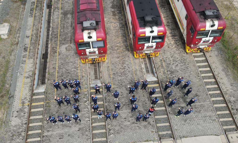 8月19日,在肯尼亞內(nèi)羅畢非洲之星鐵路運營有限責任公司機務運轉(zhuǎn)整備場,中肯兩國鐵路工作者在機車前站列并組成“3000”字樣,以紀念蒙內(nèi)鐵路實現(xiàn)安全運營3000天(無人機照片)。新華社記者 楊光 攝