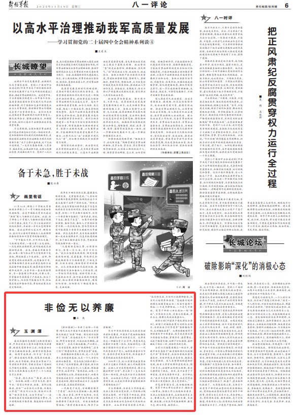 習(xí)主席強(qiáng)調(diào),生活是工作的基礎(chǔ),生活上做不到自覺(jué)自律,工作就難以做到清正廉明。對(duì)于黨員干部來(lái)說(shuō),崇儉尚廉既是個(gè)人身心健康的重要保障,也是形成良好政治生態(tài)和時(shí)代風(fēng)尚的必要條件。正如革命前輩徐特立所說(shuō):“儉樸的生活,不但可以使精神愉快,而且可以培養(yǎng)革命品質(zhì)?!敝艺\(chéng)履行使命的模范指揮員楊業(yè)功一生堅(jiān)守著兩個(gè)陣地:一個(gè)是導(dǎo)彈陣地,一個(gè)是氣節(jié)陣地。黨員干部的心田也猶如一塊“陣地”,不用儉樸之風(fēng)、清廉之風(fēng)填滿,享樂(lè)主義、奢靡之風(fēng)就會(huì)乘虛而入。