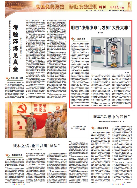“巴豆雖小壞腸胃,酒杯不深淹死人?!痹挷诶聿徊凇,F(xiàn)實中,官兵時常面臨的考驗往往不是立場方向、黨性原則、信仰信念等大問題,而正是這些“小是小非”。何況一些所謂的“小事”,其實一點都不“小”,就拿有些段子來說,它們打著“幽默”“調(diào)侃”的旗號,實則夾雜抹黑丑化、暗箭傷人的負(fù)能量,雖然不是政治謠言,可一旦牽扯到部隊這個特殊集體,關(guān)乎的同樣是思想和意識的大問題。只有經(jīng)常進(jìn)行政治體檢,不斷對思想進(jìn)行提純和凈化,增強(qiáng)思想改造的自覺性和徹底性,才能清除一切“亞健康”因素。